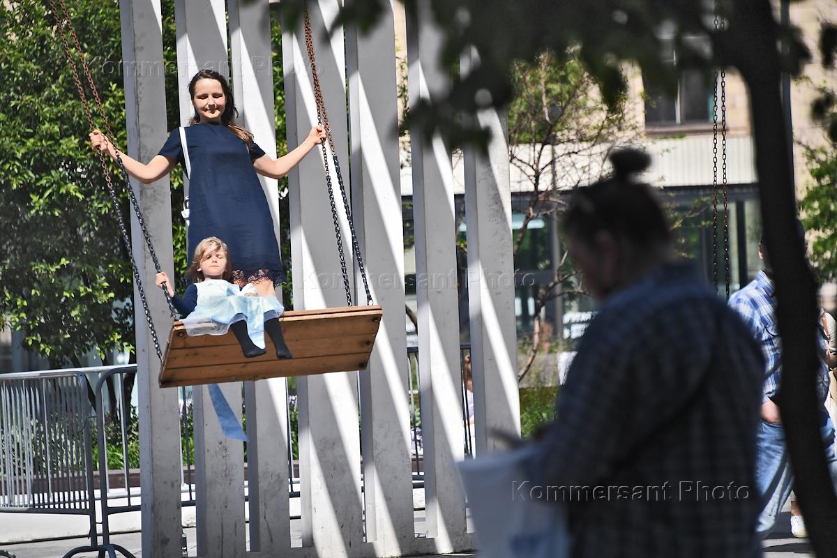 Жанровая фотография. Мама с маленькой дочерью на качелях.