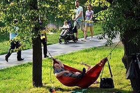 Досуг, туризм и отдых Снятие ограничений после режима самоизоляции из-за опасности распространения коронавирусной инфекции COVID-19. Жанровая фотография. Отдыхающие на Черкизовском пруду.