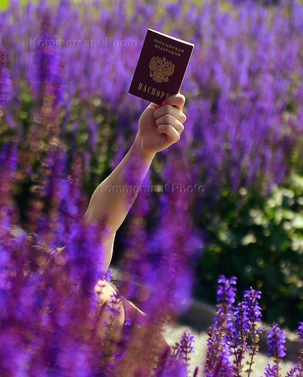 Жанровая фотография. Паспорт гражданина России в руке девушки среди цветов.