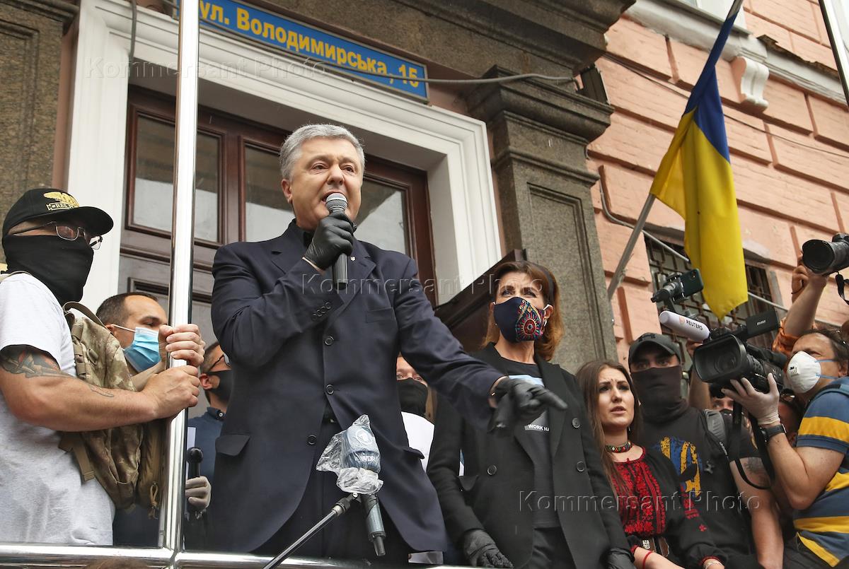 Бывший президент Украины Петр Порошенко (слева) во время выступления на митинге своих стронников у…