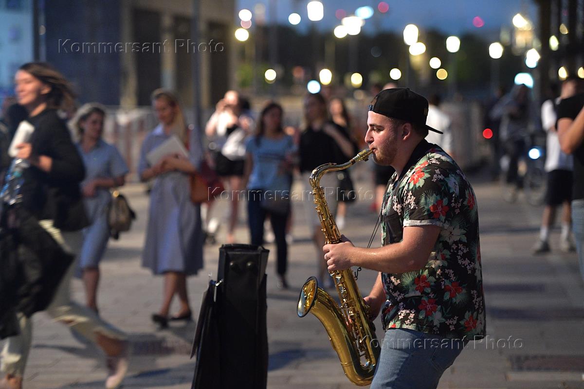 Жанровая фотография. Уличный музыкант-саксофонист во время выступления.
