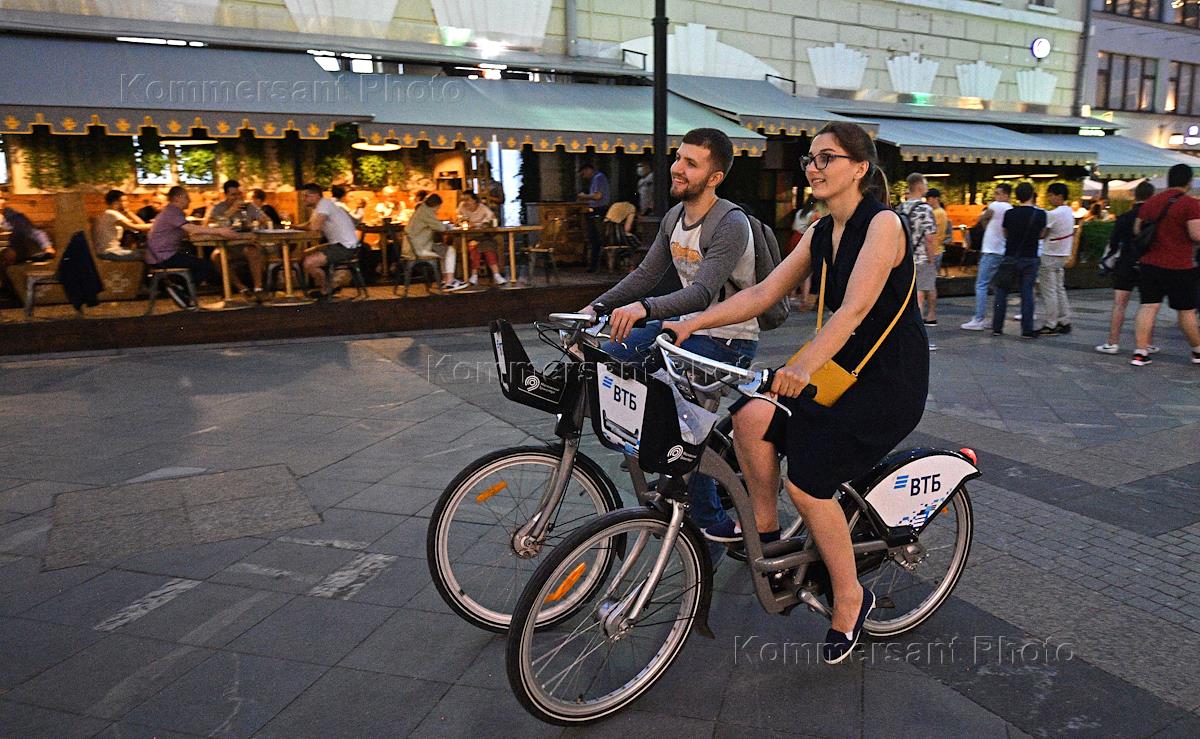 Жанровая фотография. Мужчина и женщина во время вечерней велосипедной прогулки в центре города.