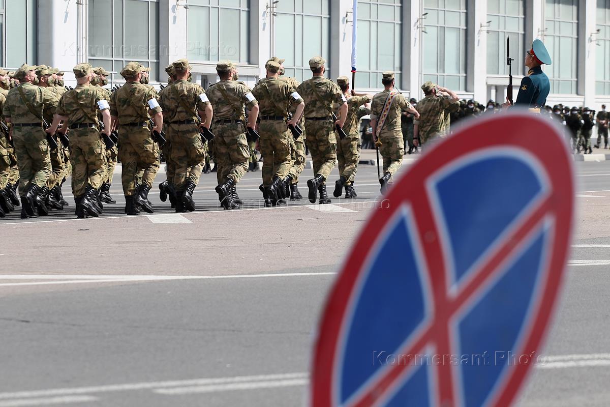 Генеральная репетиция парада, посвященного 75-летию Победы. Военнослужащие во время прохода строевых…