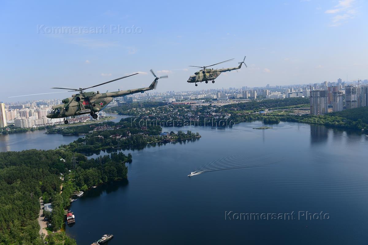 Генеральная репетиция воздушной части парада, посвященного 75-летию Победы. Вертолеты Ми-8 (справа)…