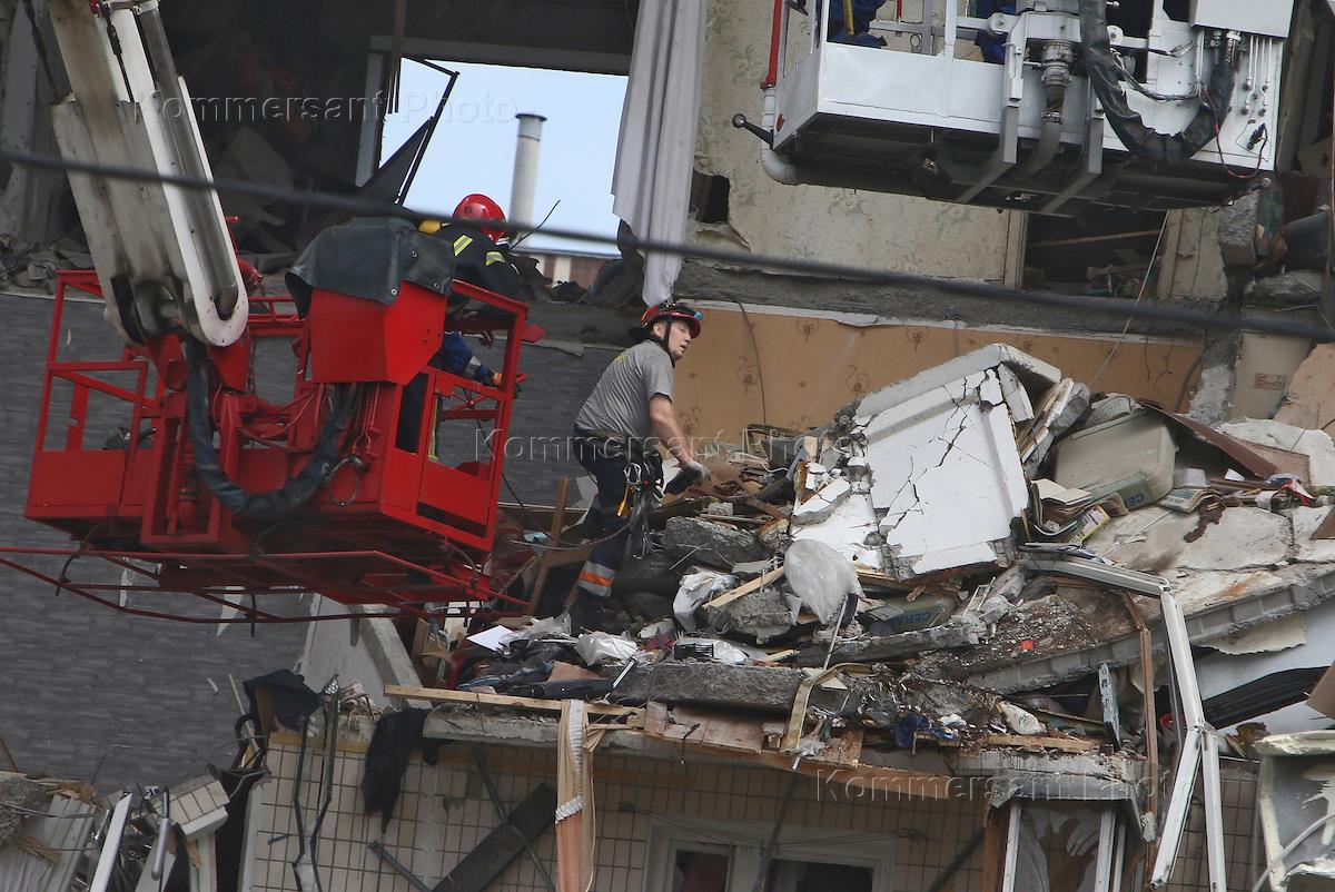 Сотрудники спасательной службы на месте взрыва в девятиэтажном жилом доме, который произошел …
