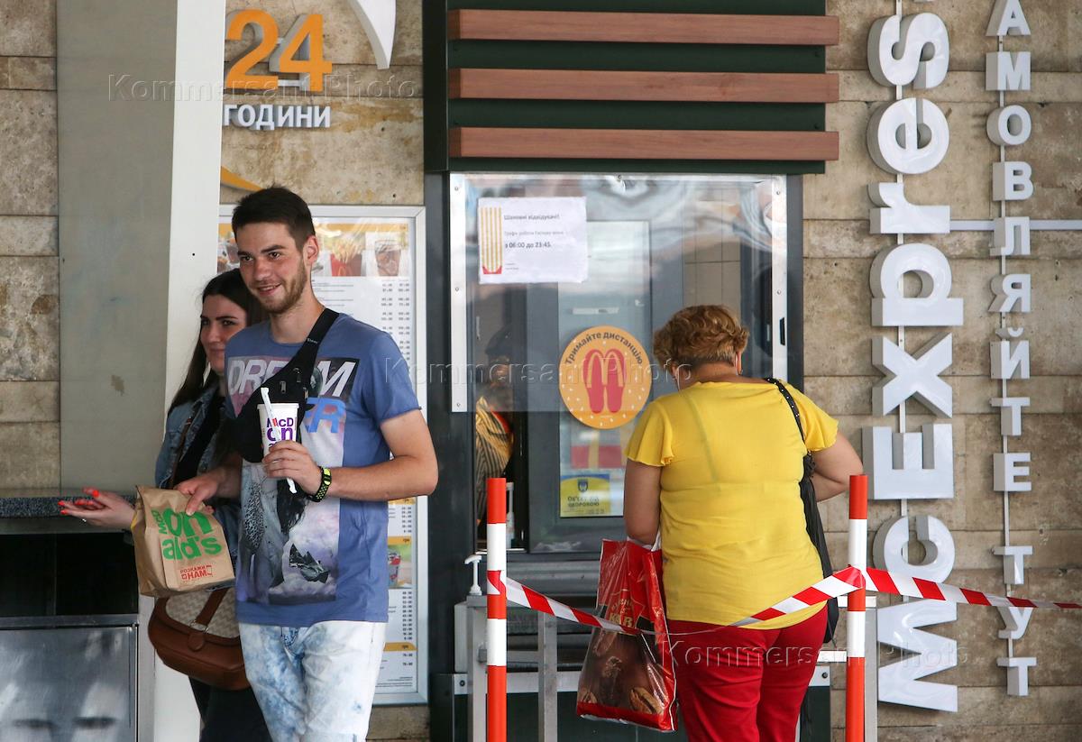 Киев во время карантина по коронавирусной инфекции COVID- 19. Посетители ресторана быстрого питания…