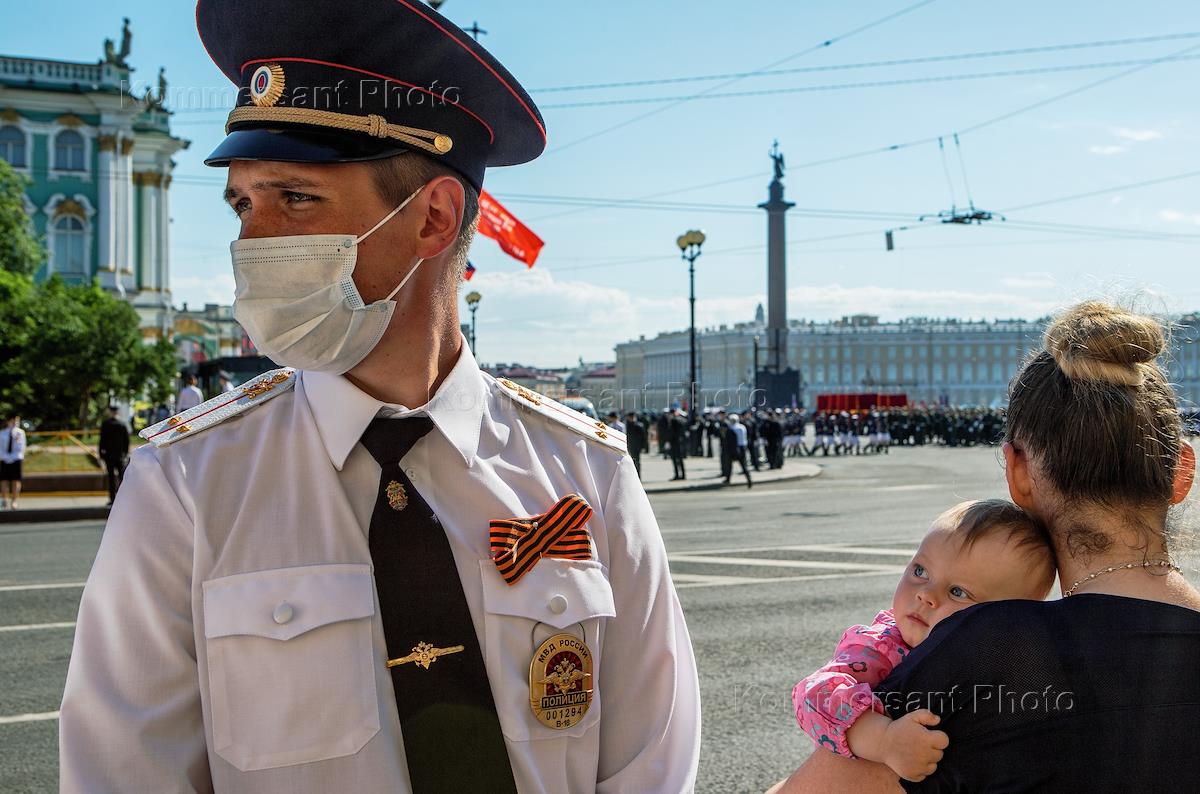 Парад, посвященный 75-летию Победы в Великой Отечественной войне. Сотрудник полиции и зрительница с…
