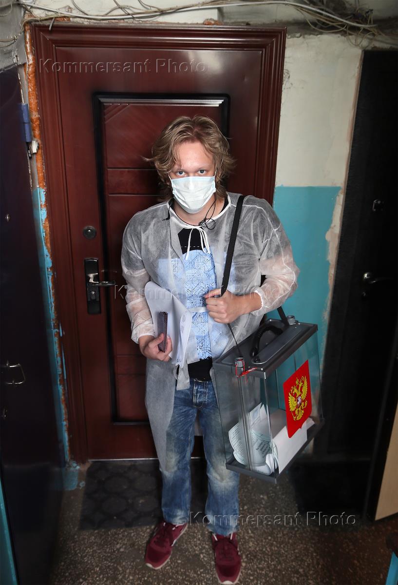 Политика Общероссийское голосование по поправкам к Конституции России. День первый. Жанровая фотография. Сотрудник избирательной комиссии с мобильной урной для голосования на дому