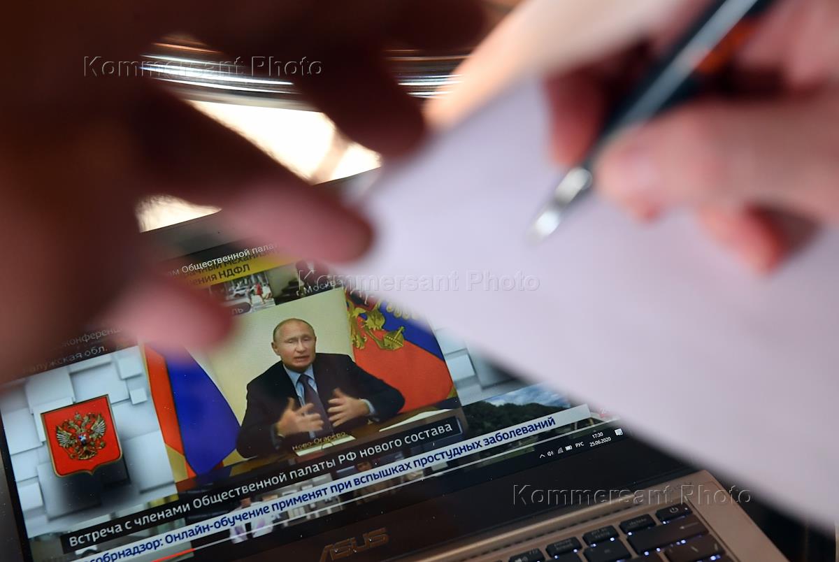 Политика Жанровая фотографи. Президент России Владимир Путин во время встречи с членами Общественной палаты седьмого состава в режиме видеоконференции.