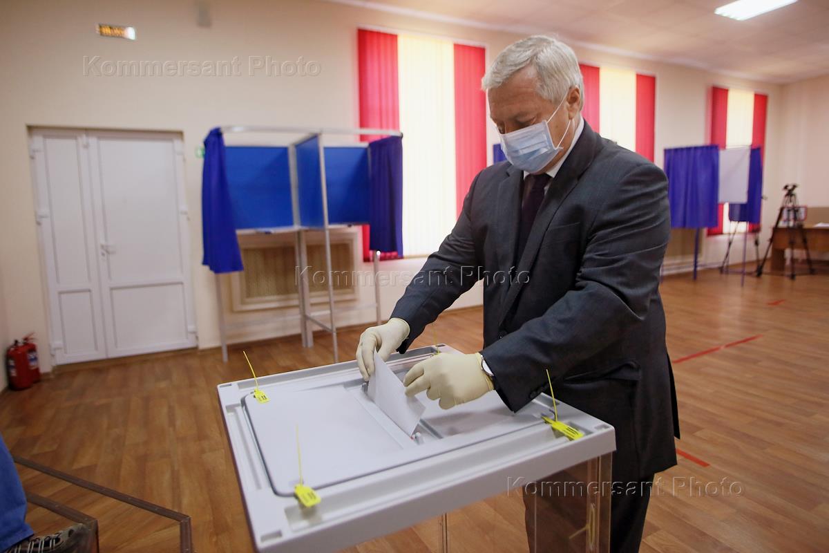 Политика Общероссийское голосование по поправкам к Конституции России. Избиратели во время голосования на избирательном участке в поселке Водопадный Аксайского района. Губернатор Ростовской области Василий Голубев во время голосования.