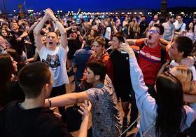 Праздник выпускников "Алые Паруса". Гуляющие перед разведенным Дворцовым мостом.