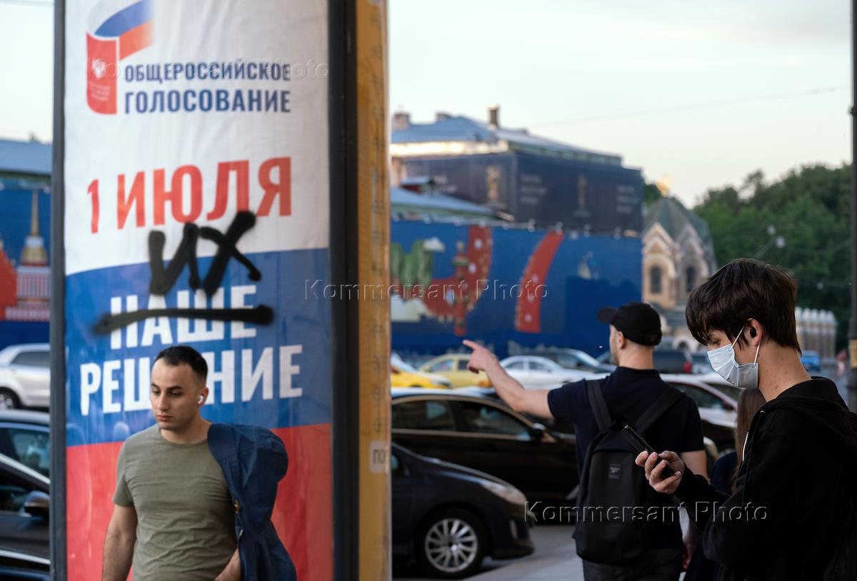 Общероссийское голосование по поправкам к Конституции России. Молодые люди у агитационного плаката…
