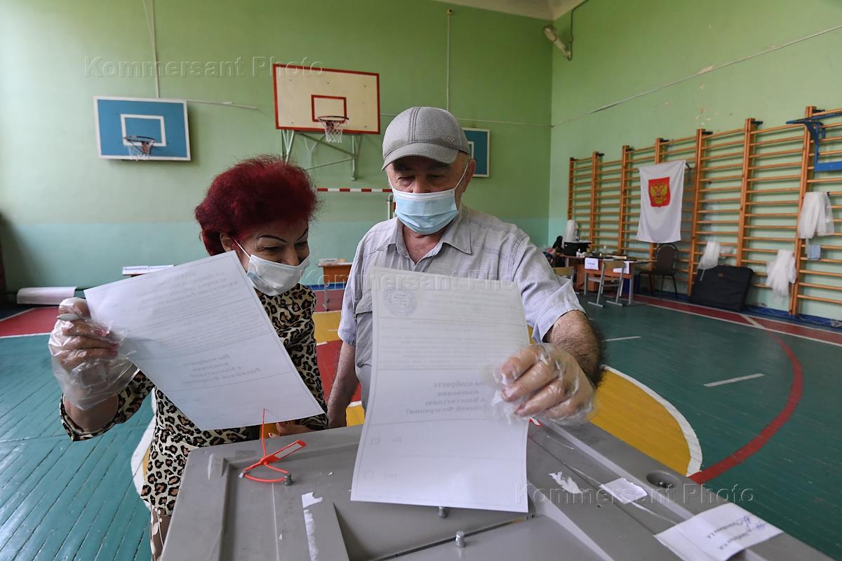 Общероссийское голосование по поправкам к Конституции России. Работа избирательных участков. Мужчина…