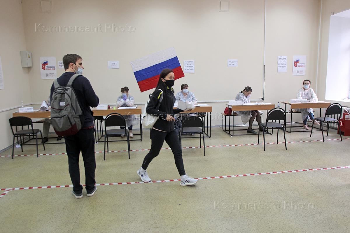 Общероссийское голосование по поправкам к Конституции России. Избиратели на избирательном участке.