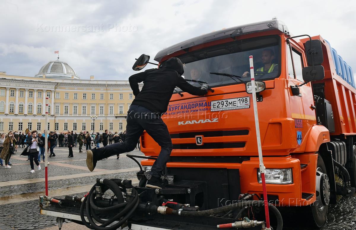 Сотрудники полиции и участники пикета против изменения Конституции России на Дворцовой площади.
