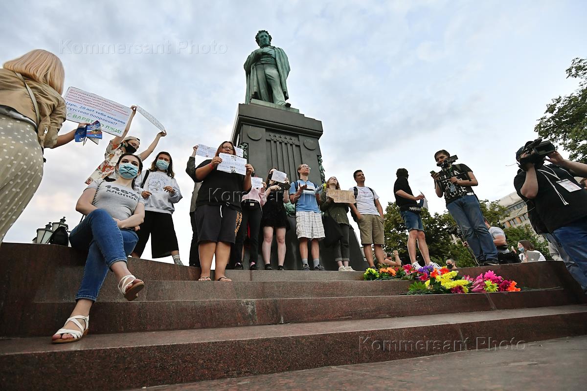 Участники несанкционированного митинга против изменения в Конституцию России на Пушкинской площади.