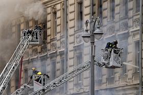 Пожар в жилом доме по адресу Тверская улица, 24. Сотрудники коммунальных служб на месте происшествия.