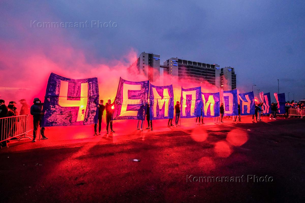 Игроки Футбольного клуба "Зенит", досрочно завоевавшего титул чемпиона России по футболу, в…