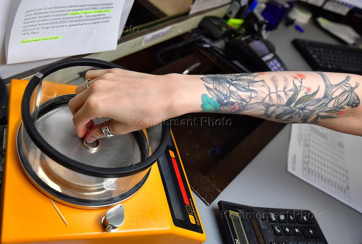 Отделение Мосгорломбарда на улице Орджоникидзе, д. 6/9. Жанровая фотография. Сотрудница ломбарда во…