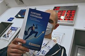 Работа отделения ПАО "Совкомбанк". Жанровая фотография. Клиент банка в медицинской маске с брошюрой…