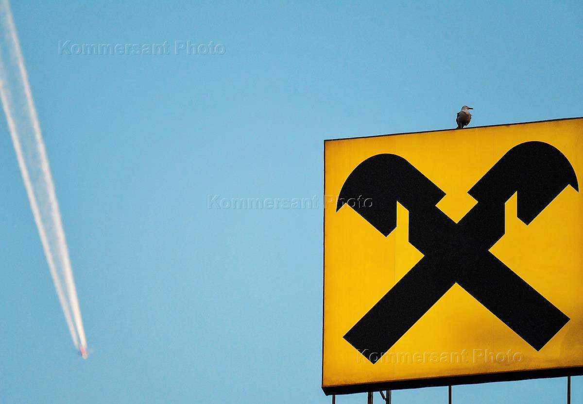 Жанровая фотография. Самолет в небе и птица на вывеске Райффайзенбанка.