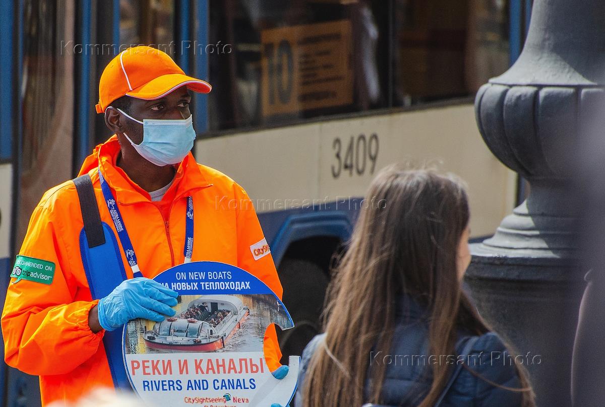 Виды Санкт-Петербурга. Жанровая фотография. Мужчина с рекламой речных прогулок.