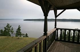Духовно-культурной кремль "Богатырская Слобода" на Самарской Луке. Туристы на веранде терема.