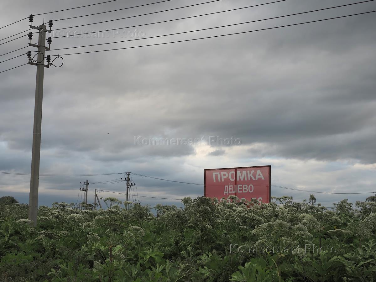 Жанровая фотография. Пустой рекламный щит на фоне коттеджного поселка в Ленинградской области.