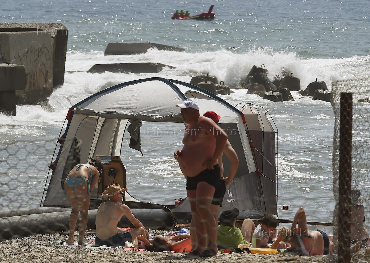 Разгар курортного сезона. Жанровая фотография. Отдыхающие с палаткой на пляже.