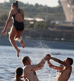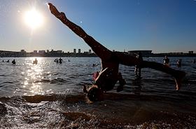 Виды Волгограда. Жанровая фотография. Пляжный отдых. Отдыхающие купаются в реке Волге.