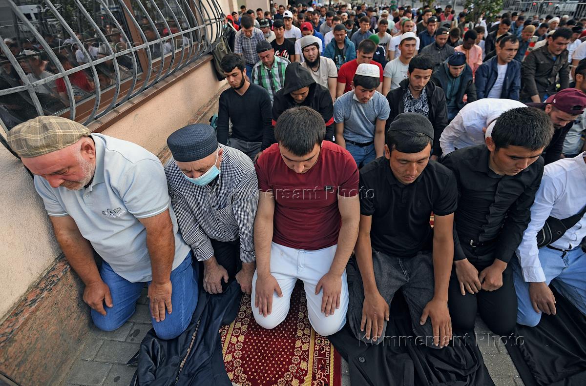 Праздник жертвоприношения Курбан-Байрам на территории Московской Соборной мечети. Верующие во время…