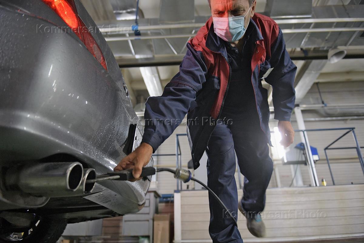 Работа пункта технического осмотра автомобилей. Сотрудник во время осмотра ходовой части автомобиля.