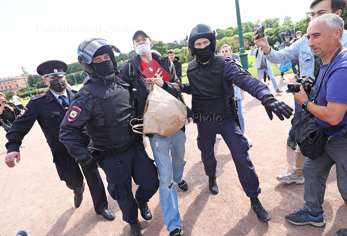 Акция солидарности с протестующими в Хабаровске. Сотрудники полиции во время задержания участников…