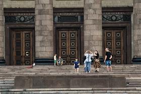 Виды Москвы. Жанровая фотография. Семья фотографируется у входа в здание Московского…