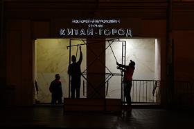 Виды вечерней Москвы. Жанровая фотография. Сотрудники служб метрополитена проверяют вывеску над…