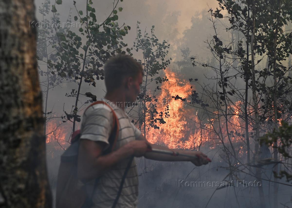 Лесные пожары в Омской области. Специально обученная бригада работников лесхоза поселка Большие Уки…