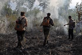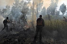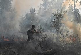 Лесные пожары в Омской области. Специально обученная бригада работников лесхоза поселка Большие Уки во время тушения пожаров.
