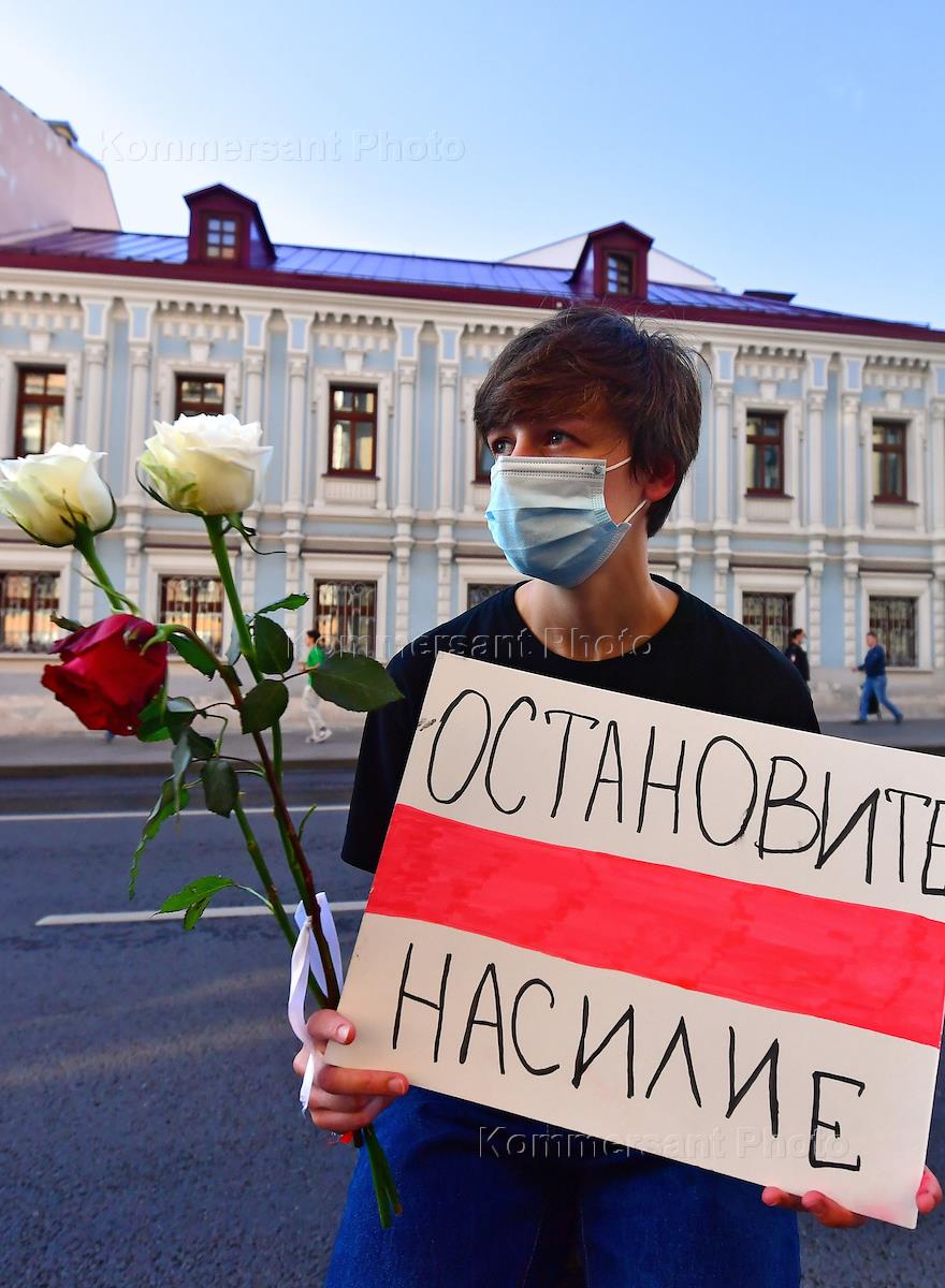 Общество Акция солидарности в поддержку жителей Белоруссии, которые протестуют против официальных результатов президентских выборов, у здания посольства Белоруссии в Москве.