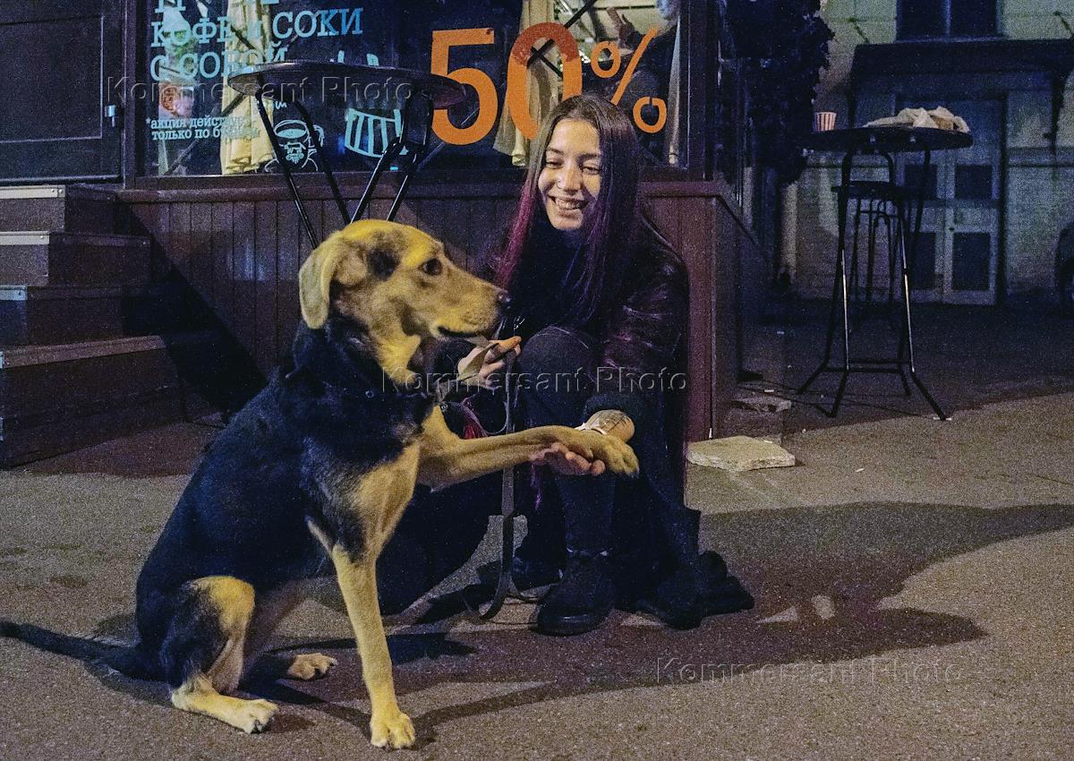 Виды Санкт-Петербурга. Жанровые фотографии. Девушка с собакой на вечерней прогулке.
