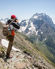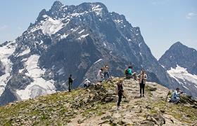 Жанровые фотографии. Туристы на вершине горного хребта Домбай.