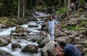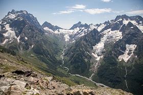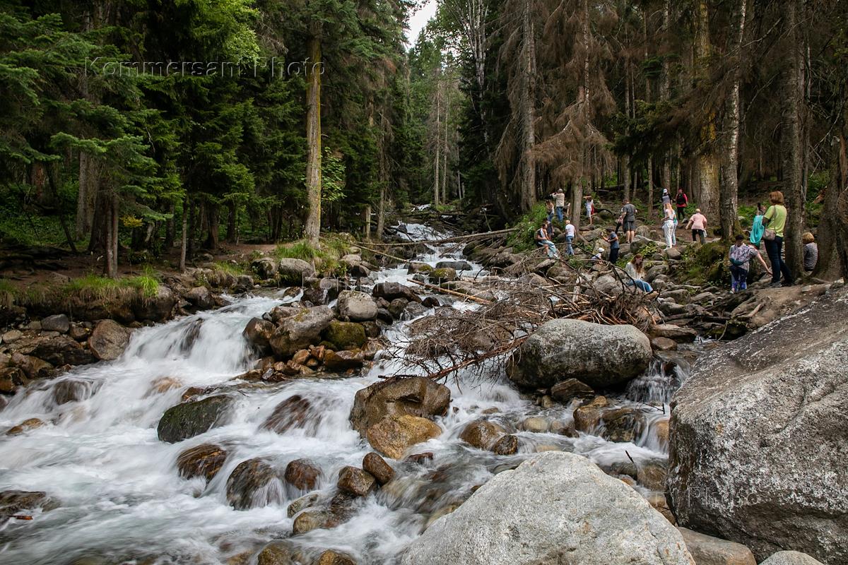 Виды Домбая. Жанровая фотография. Туристы у реке Уллу-Муруджу.