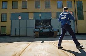 Работа бронетанкового завода №61 в Стрельне. Вывоз танка из ангара на показательный маневр.