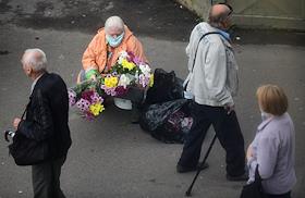 Виды Санкт-Петербурга. Жанровая фотография. Женщина в медицинской маске продает на улице букеты…