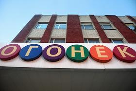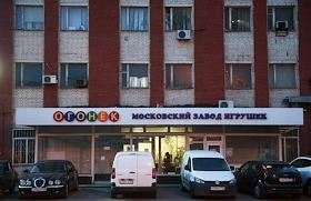 Здание завода игрушек "Огонек". Жанровая фотография. Объявление "аренда" в окнах на фасаде здания.