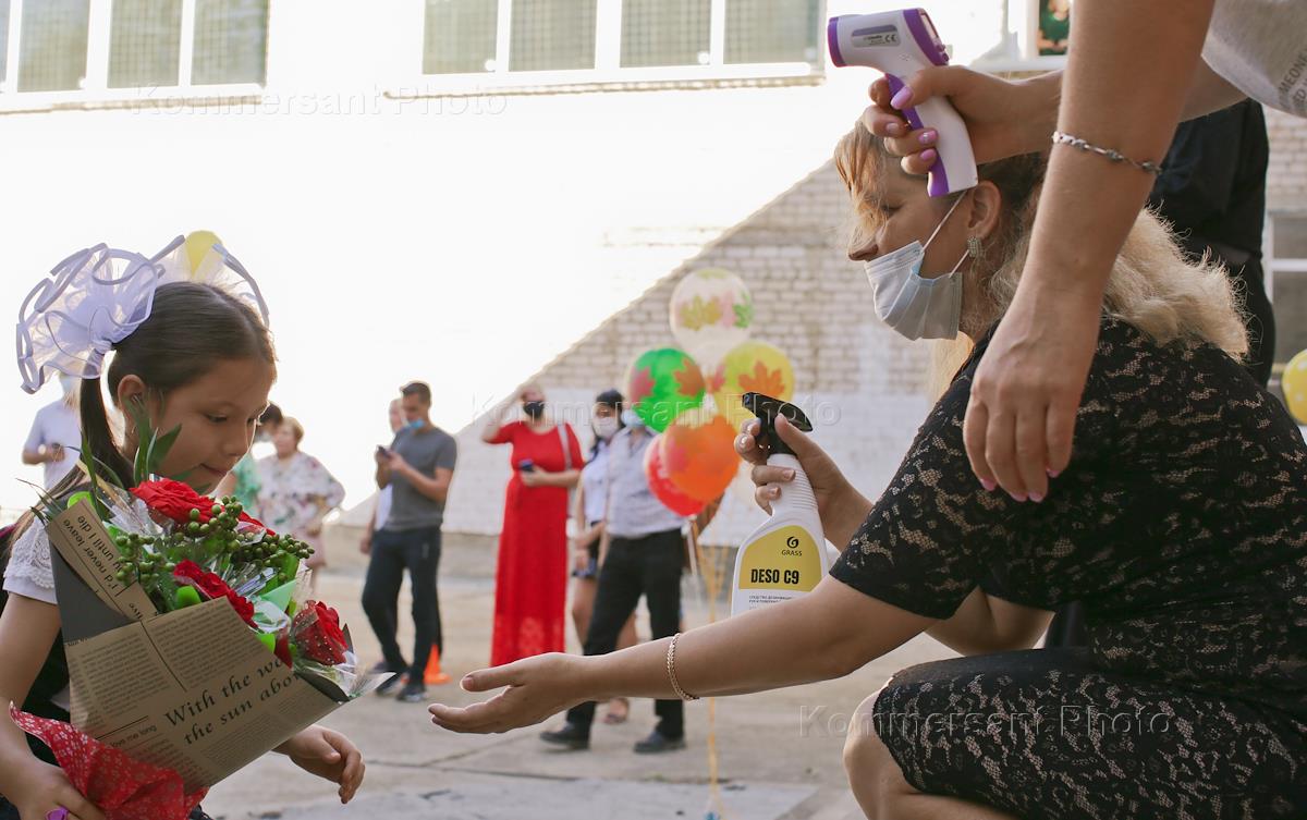 День знаний (1 сентября). Торжественная линейка в школе №23 в городе Волжский. Ученикам измеряют…