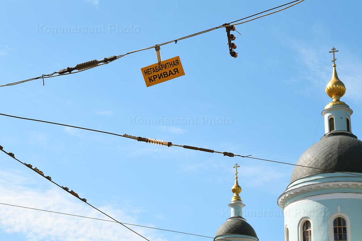 Жанровая фотография. Указатель "негабаритная кривая" на проводах.