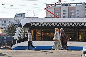 Виды Москвы. Жанровая фотография. Женщины-мусульманки на фоне трамвая.