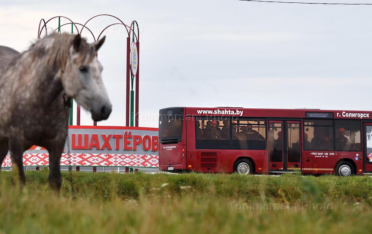 Виды Солигорска. Жанровая фотография. Лошадь на лугу у стелы "Солигорск - город шахтеров" и…