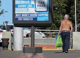 Политическая ситуация в Минске. Жанровая фотография. РЕклама "Экономный шопинг для туристов" на…