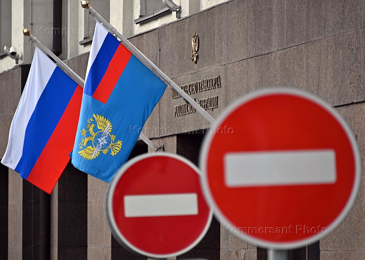 Виды Москвы. Жанровая фотография. Флаги и дорожные знаки "въезд запрещен" у входа в здание…